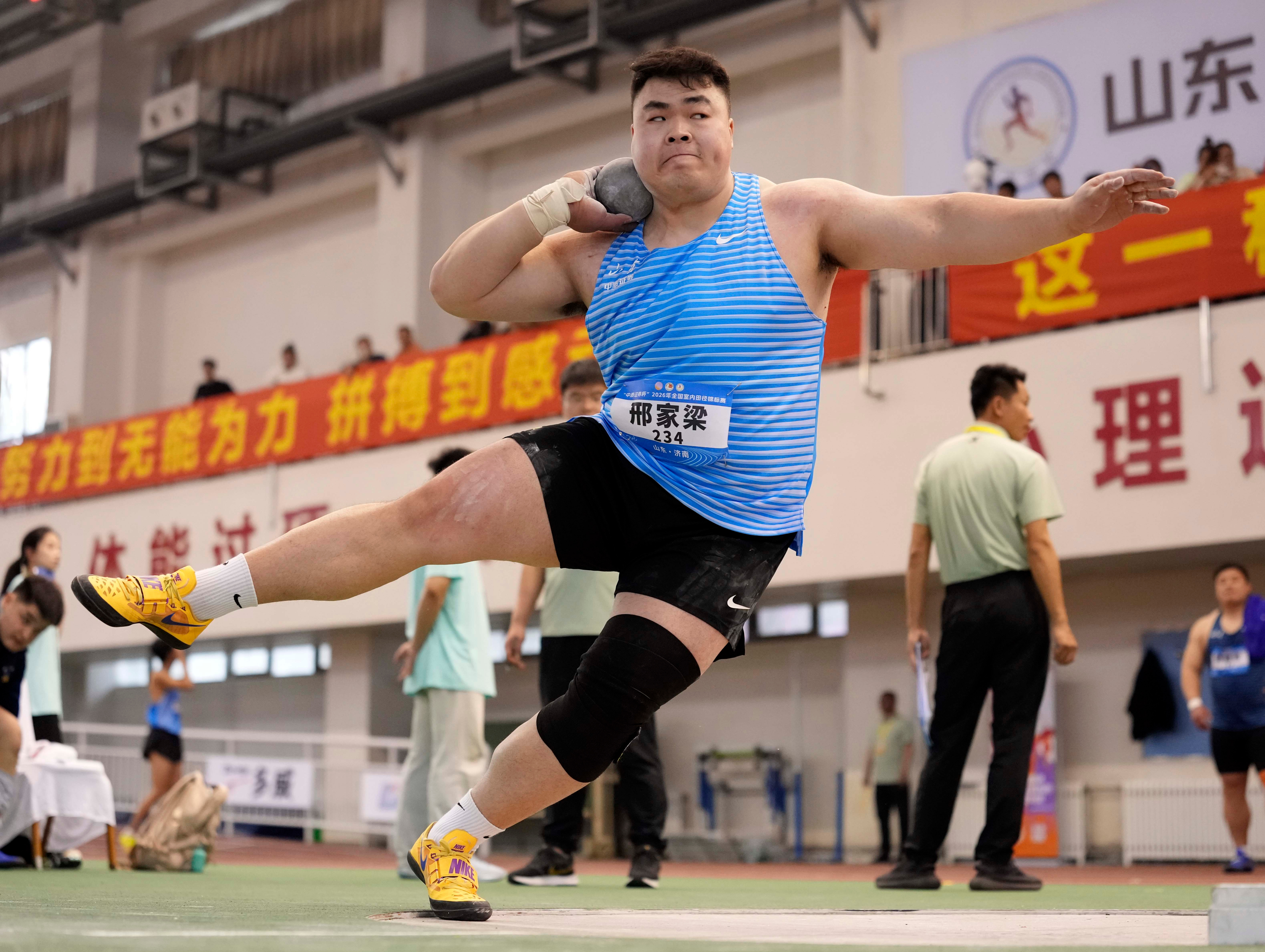 3月27日,山东中泰证券队选手邢家梁在男子铅球决赛中。他获得冠军。新华社记者 雒圆 摄
