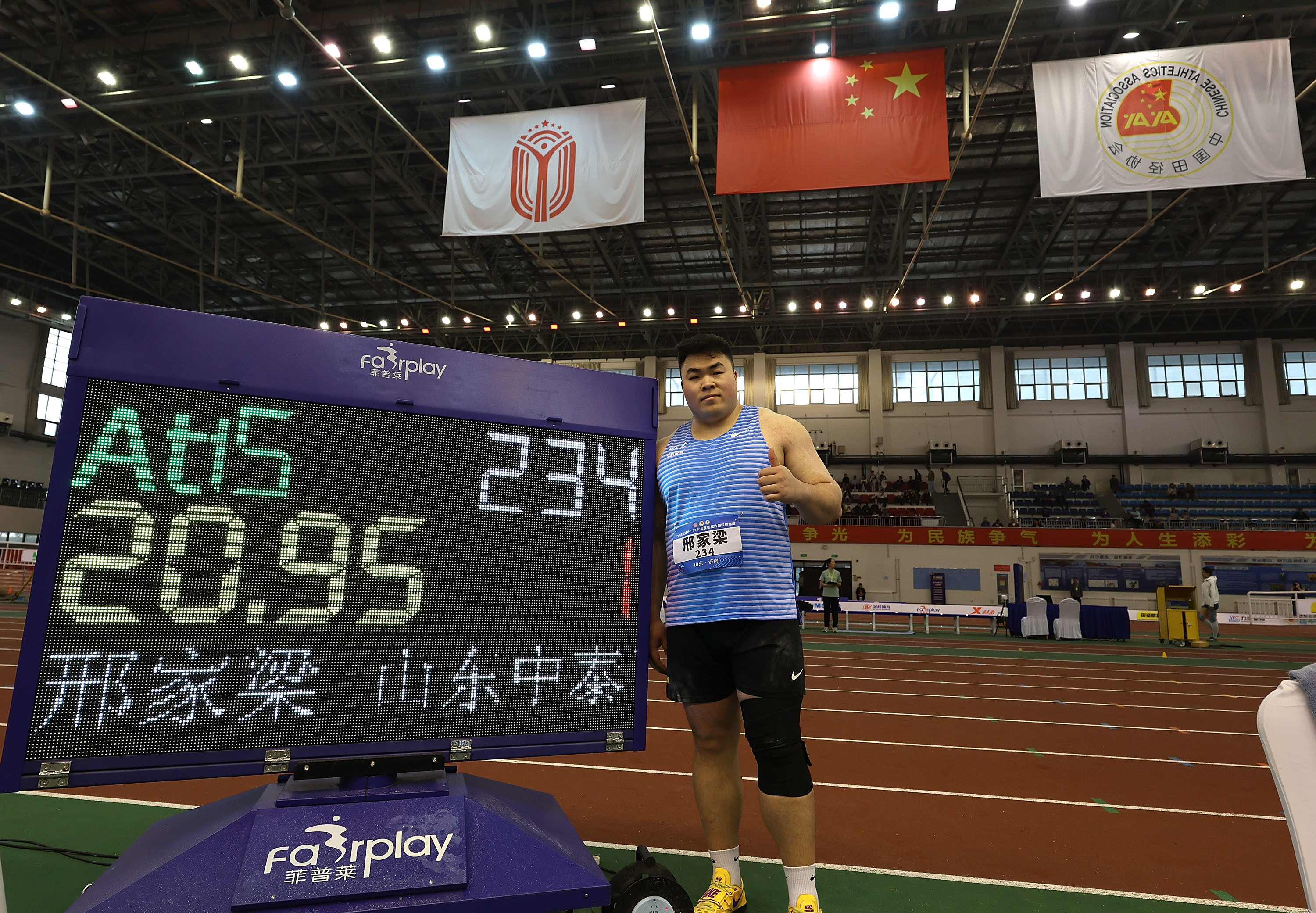 3月27日,山东中泰证券队选手邢家梁在男子铅球决赛中。他以20米95的成绩夺得冠军。 新华社记者 廖宇杰 摄