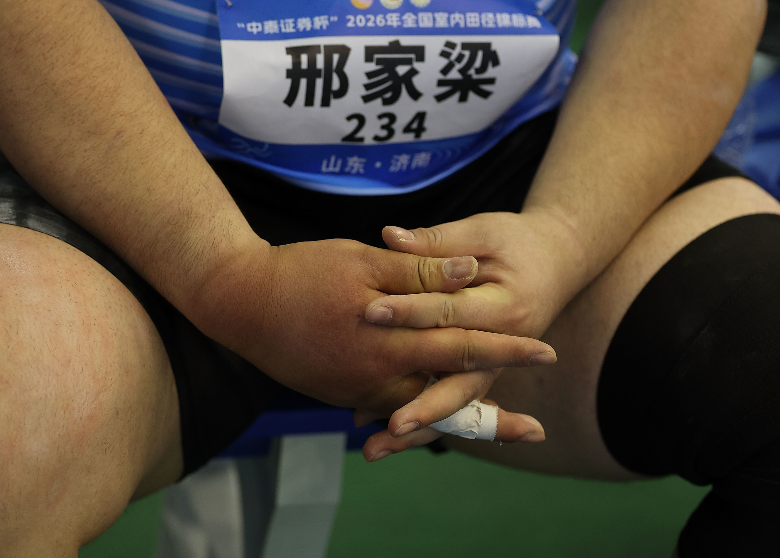 3月27日,山东中泰证券队选手邢家梁在男子铅球第五次试投后等待测量结果。最终,他以20米95的成绩夺得冠军。 新华社记者 廖宇杰 摄