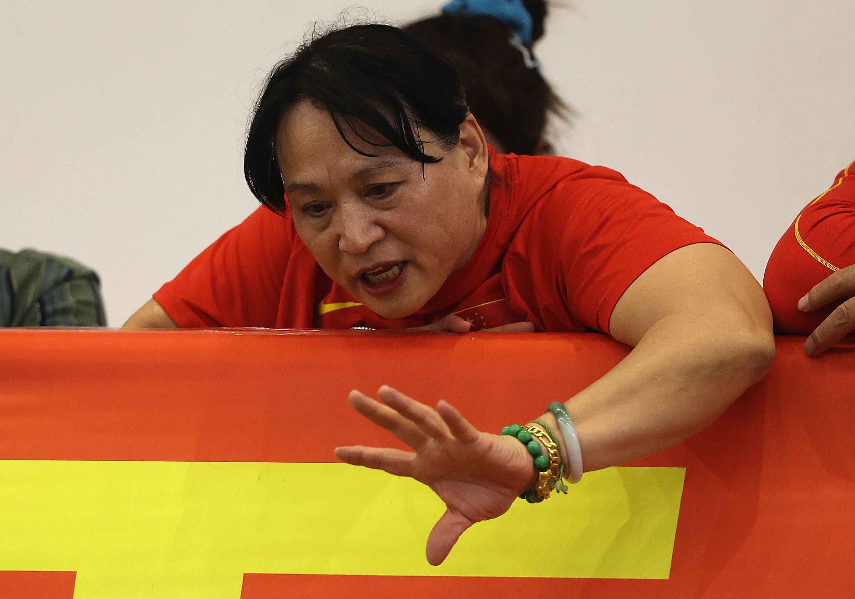 3月27日,山东中泰证券队选手邢家梁的教练丛玉珍在看台与邢家梁交流。最终,邢家梁以20米95的成绩夺得冠军。 新华社记者 廖宇杰 摄