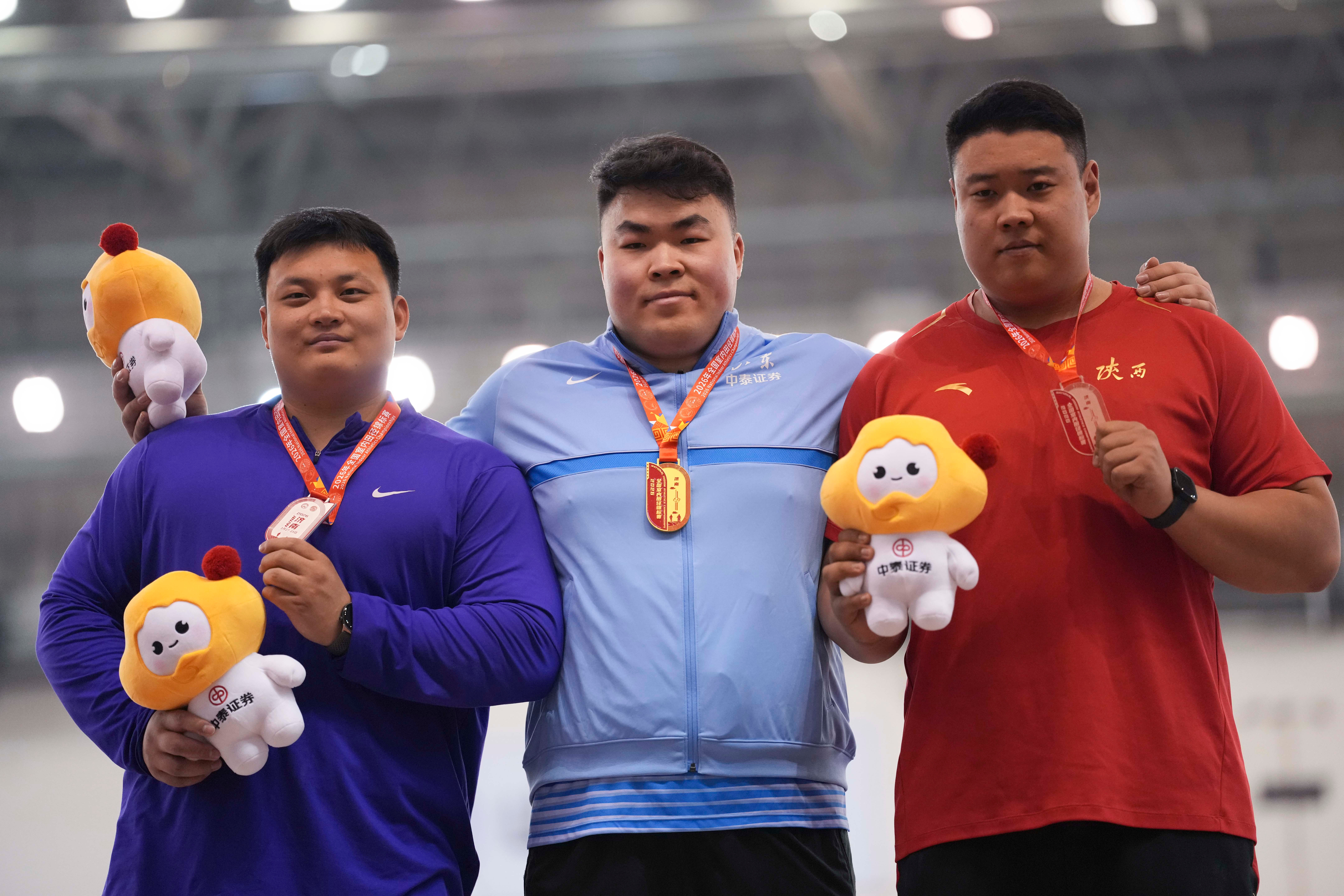 3月27日,男子铅球冠军山东中泰证券队选手邢家梁(中)、亚军四川队选手陈成雨(左)和季军陕西队选手张振宇在颁奖仪式上。新华社记者 雒圆 摄